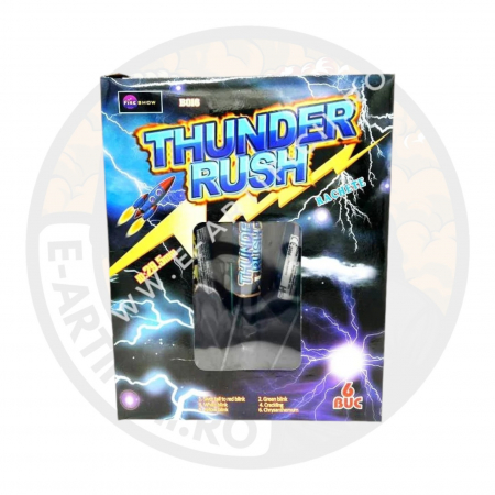 Instrucțiuni de utilizare în condiții de siguranță: a se amplasa racheta în poziție orizantală pe un teren plan, cu textul “ Această parte în sus” deasupra. A se aprinde capătul cel mai indepărtat al fitilului, din poziție laterală și a se retrage imediat la cel puțin 20 m.