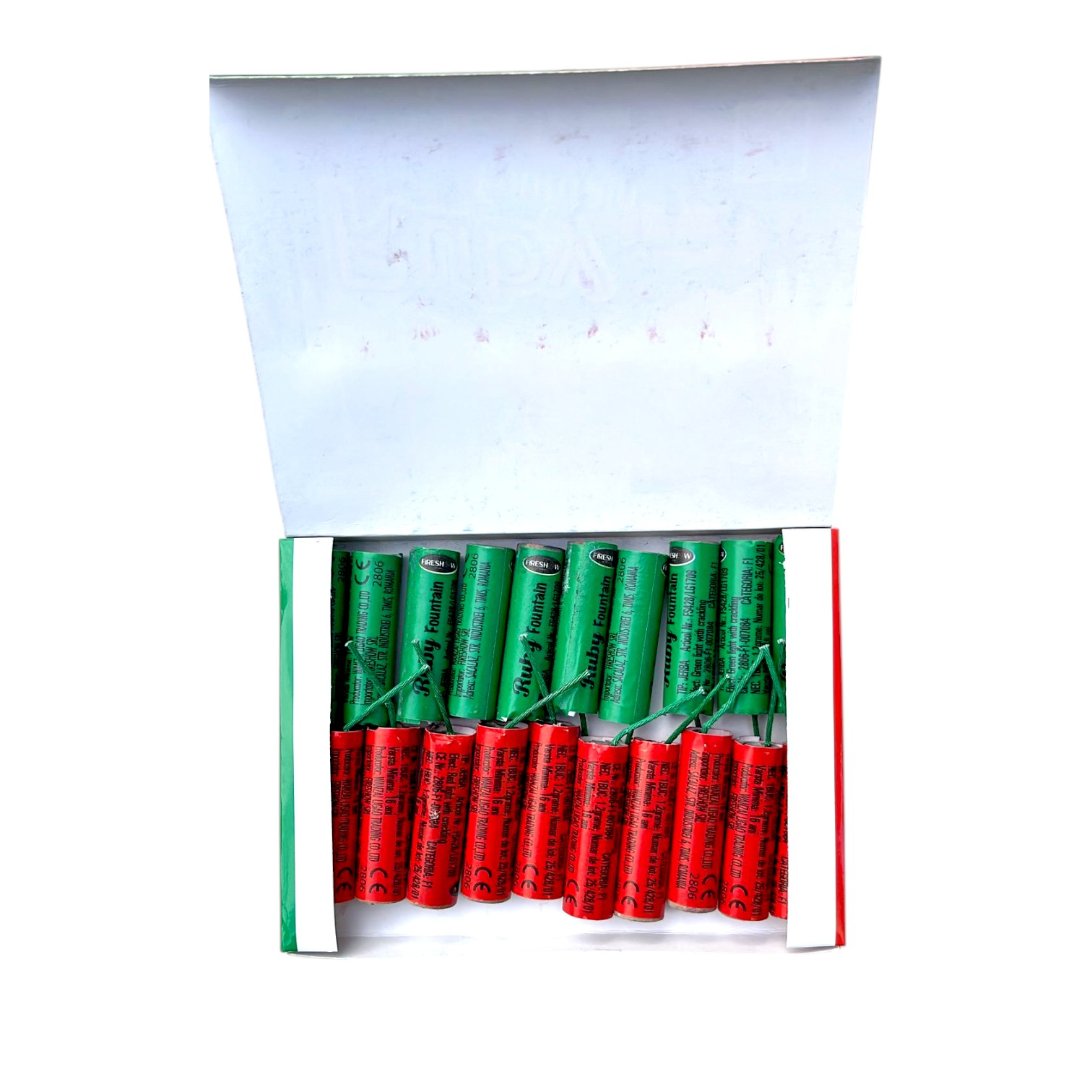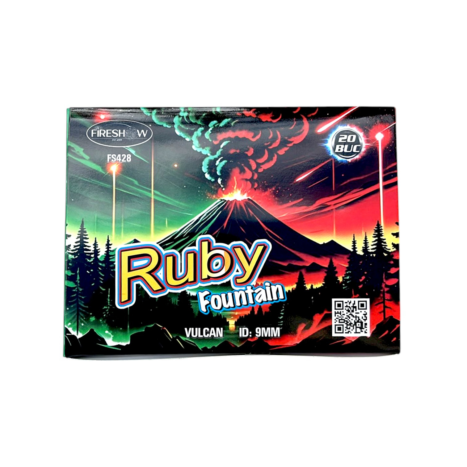 Vulcanul Ruby Fountain este o fântână pirotehnică spectaculoasă care oferă un show vizual intens. La aprindere, produce o flacără colorată (verde sau roșie, în funcție de tub), urmată de un jet continuu de scântei aurii ce se ridică la 1–2 metri. Efectul durează între 20 și 40 de secunde și se încheie cu o “ploaie” strălucitoare de scântei. Produsul face parte din categoria F1, are un nivel redus de zgomot și este destinat utilizării în aer liber, pe suprafețe stabile, la o distanță de siguranță de minimum 5–8 metri.